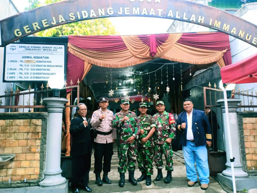 Boyolali, jakartawaspada.com | Koramil 01/Kota Kodim 0724/Boyolali yang dipimpin Danramil Kapten Cba Pujiarto bersinergi dengan Polsek Kota serta Ormas, melakukan pengamanan kegiatan ibadah perayaan Natal umat Nasrani di Gereja Sidang Jemaat Allah Imanuel Boyolali, Jl. Padanaran No.98, Desa Siswodipuran, Kecamatan Boyolali, Kabupaten Boyolali. Senin malam (25/12/2023).